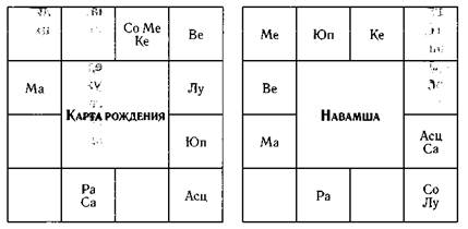 Обычно асцендент в Деве можно обнаружить в гороскопах людей, страдающих многочисленными заболеваниями, но также и у спортсменов, актеров, артистов и даже политиков. Причина в том, что мутабельный земной знак, Дева, наделяет рожденных под ним не только телесной хрупкостью, но также умениями и приспособленностью к успешной деятельности в материальном мире. Джо Монтана, самый известный футболист-куотербэк последних десятилетий, является подходящим примером спортсмена с восходящей Девой, но можно было бы рассмотреть и несколько других подобных гороскопов. При этом гороскоп Монтаны демонстрирует способность зловредных планет в упачайях, или растущих домах (3-м, 6-м и 11-м) дать хорошее здоровье и соревновательный настрой. Как и в некоторых других картах, которые мы рассмотрели, здесь мы видим мощный Марс в шестом доме, дающий умение и силы соревноваться. Марс в данном случае является планетой, аспектирующей одновременно и асцендент, и его хозяина, Меркурий. Это дает проворство, свойственное асценденту в Деве, одновременно с силой и волей к победе, присущими Марсу. Еще нужно отметить, что в навамше Марс экзальтирует в шестом доме. В дополнение Марс в Водолее обменивается знаками с Сатурном в Скорпионе в третьем доме. Сатурн в третьем доме — еще одно подтверждение интереса Джо к спорту и соревновательного азарта. При этом Сатурн аспектирует Меркурий и привносит в конституцию некоторые вторичные вата-черты, так же как и мер-куриальное влияние асцендента. Меркурий (в Тельце) и Венера (в Близнецах) обмениваются знаками, будучи десятым и девятым управителями, что является наилучшей раджа йогой — комбинацией славы и признания. Впрочем, эти вредители в домах упачайя, хотя и благоприятны для здоровья, могут вызвать проблемы из-за несчастных случаев и перенапряжения. Вскоре после начала периода Кету Монтана получил травму спины, от которой быстро оправился, но она чуть было не поставила крест на его карьере. Как бывает в случаях с подобного рода спортсменами, последствия таких травм проявляются с возрастом.