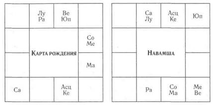 Карта Жаклин Кеннеди — превосходный пример могущества загадочного Раху. Раху в первую очередь ответствен за ее вата-, или воздушную конституцию и необыкновенную жизнь, которая была отмечена неожиданными событиями и всемирной известностью, которая была скорее проклятием, чем благословением. Джэки была худенькой, сверхчувствительной, физически слабой, — ось Раху-Кету затрагивает ее асцендент и Луну, привнося разнообразные осложнения, равно как головокружительные взлеты и падения в жизни. Раху расположен в пределах градуса в точной оппозиции ее воздушному асценденту в Весах и в одном знаке с Луной. В седьмой дом он попадает и в навамше. Между тем падающий Сатурн довлеет над Луной в навамше, привнося еще ваты и на этот уровень. Луна неудачно расположена, если посмотреть ее градусы и накшатру — в уязвимой (ганданта) позиции в начале Ашвини. Раху, расположенный в соединении с Луной, — это предпосылка к затмению. Луна также является десятым управителем и дает славу и признание. Жаклин пережила убийство своего мужа (седьмой дом), который был самым могущественным человеком в мире. Эта трагедия наложила отпечаток на ее характер. Джэки заболела раком — заболеванием ваты, и ушла из жизни весьма внезапно, в период Раху, в подпериод Луны! Хозяйка ее асцендента, Венера, находится в восьмом доме смерти вместе с Юпитером, хозяином шестого дома болезней. При этом Венера в падении в навамше. Подобная комбинация Венера-Юпитер не способствовала долголетию Жаклин, хотя две планеты в восьмом доме завещанного богатства все же сделали ее безумно богатой. В ее случае ношение алмаза помогло бы продлить жизнь, так как алмаз защитил бы асцендент и Венеру.