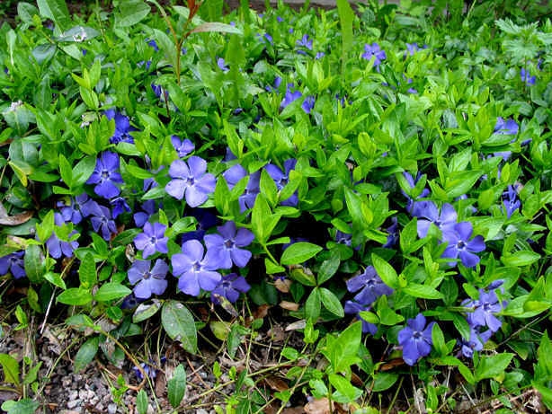 Барвинок малый Барвинок малый (Vinca minor L.) – многолетний вечнозеленый кустарничек из семейства кутровых. Стебли ветвистые, ползучие, способные укореняться, длиной до 100—150 см и вертикальные— высотой 30—35 см. Листья на коротких черешках, супротивные, эллиптические, цельнокрайние, кожистые, блестящие. Одиночные синие цветки расположены в пазухах листьев на длинных цветоносах.