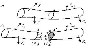 Взаимодействие между частями рассматриваемого тела характеризуется внутренними силами, которые возникают внутри тела под действием внешних нагрузок и определяются силами межмолекулярного воздействия. Эти силы сопротивляются стремлению внешних сил разрушить элемент конструкции, изменить его форму, отделить одну часть от другой. В брусе сечение проводят перпендикулярно его оси. Такое сечение называют поперечным. Величины внутренних усилий определяются с применением метода сечений, суть которого заключается в следующем. Если при действии внешних сил тело находится в состоянии равновесия, то любая отсеченная часть тела вместе с приходящимися на нее внешними и внутренними усилиями также находится в равновесии, следовательно, к ней применимы уравнения равновесия. Рассмотрим тело, имеющее форму бруса (рис. 1.4, а). Пусть к нему приложена некоторая система внешних сил Р 1, Р 2, Р 3,..., Рn, удовлетворяющая условиям равновесия, т.е. при действии указанных внешних сил тело находится в состоянии равновесия. Если рассечь брус сечением А на две части и правую отбросить, то, т.к. связи между частями тела устранены, необходимо действие правой (отброшенной) части на левую заменить некоей системой внутренних сил (PА ), действующей в сечении А (рис. 1.4, б).