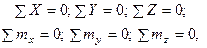 Последние два векторные уравнения равновесия дают шесть скалярных уравнений в проекциях на декартовых осях координат: