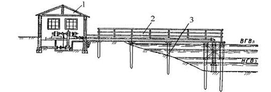 1–насосная станция; 2 – эстакада; 3–всасывающие трубы; 4 – ледорезы