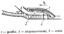 b = QB/(H*VB), м, (69) где H – необходимая глубина ковша, рассчитываемая по формуле 44, м VB – скорость входа воды в ковш, равная: · при режиме деления 0,9VP, т. е. когда отбор воды из ковша относительно большой (по сравнению с расходом воды в реке). При этом в сечении ниже отбора воды в реке образуются меньшие глубины и скорости течения. Поэтому вода поступает со скоростями, равными или большими, чем скорость воды в реке. Таким образом, при режиме деления отбор воды оказывает существенное влияние на речной поток; · при режиме водообмена 0,6VP, т. е. при отборе из реки относительно малых количеств воды, которые не оказывают влияния на режим реки. где VP – скорость движения воды в реке, м/с. 5. Полная длина водоприемного ковша: