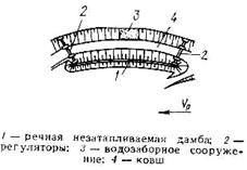 На реках с наличием большого количества внутриводного льда (шуги) или наносов, с малыми глубинами и недостаточными расходами в межень целесообразно применение водозаборных ковшей. Ковшевой водозабор – это береговой водозабор совмещенного или раздельного типа, перед которым устраивается искусственный водоем – ковш, располагаемый непосредственно в реке или в береге (см. рис. 4.10, 4.11). Применение ковшей ограничено из-за высокой стоимости строительства и заборе воды больше 5 м3/с. По характеру подвода воды из рек различают ковши: · верхового питания – с подводом воды по течению, когда река несет большое количество наносов. Данный тип ковша частично или полностью выдвинутый в русло реки, как средство защиты водозабора от шуги и взвешенных наносов не рекомендуется; · двойного питания – с подводом воды по и против течения, применяется, когда река несет большое количество наносов и шуги. Такие ковши устраиваются для повышения бесперебойности работы водозабора, но им следует предпочитать забор воды из различных мест русла и источников, подвод теплой воды в ковш и т. д.; · низового питания – с подводом воды против течения, применяются для борьбы с шугой, чтобы шуга, которая идет вверху, протекала мимо. Расчет водоприемного ковша производится в следующей последовательности: 1. Обосновывается необходимость ковша и намечается его тип в зависимости от характеристики реки (ширина, судоходность и т. п.) и берегов.