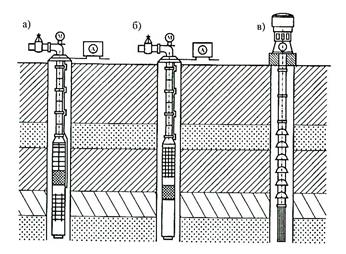 Рис. 10.11. Схемы размещения насосов в скважинах: а) электронасос ЭПН; б) погружной центробежный насос ЭЦНВ; в) глубинный артезианский насос АТН