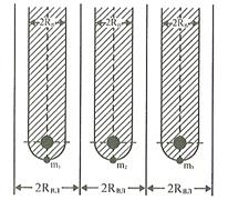 Расчет группы колодцев заключается в определении их числа, производительности и расстояния между ними. Взаимодействие двух или нескольких колодцев в грунтовом потоке определяется положением зон питания и влияния. Возможны три основные схемы размещения колодцев. Первая схема (рис. 10.9). Колодцы находятся друг от друга на расстоянии, равном или большем двух радиусов влияния (2R). Дебит каждого колодца не зависит от дебита и глубины откачки других колодцев и может быть определен по формулам дебита одиночного колодца.