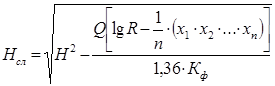где q - дебит одиночного колодца. Число запасных колодцев назначается после окончания расчета и уточнения числа рабочих колодцев. 3. Проверяется величина слоя воды Нсл у колодца, находящегося в центре группы колодцев, уравнением