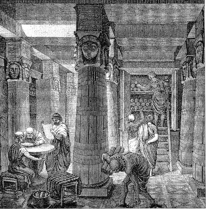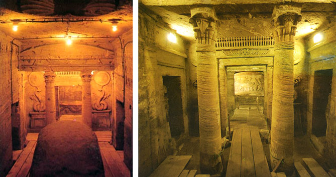Сейчас нижние уровни подземелья затоплены водой, но два верхних доступны для посещений. Когда вы будете их осматривать, экскурсоводы сообщат, что ранее эти протяженные лабиринты использовались для захоронений, и услужливо покажут ниши, где когда-то стояли саркофаги. Осталось их несколько, есть с греческими знаками-письменами на фюзеляже. Подземелья эти были случайно обнаружены в 1900 году. Менее посвященные или еще не инициированные студиозусы проходили обучение в университетах на поверхности. Один из них найден в районе Ком Ад-Дикка, ранее считали что это просто амфитеатр, предназначенный для эмоциональных утех публики. Обучение начиналось, когда будущему жрецу исполнялось четыре года – тогда проводилась первая инициация по сложному обряду, а заканчивалось не ранее чем к двадцати годам. Возможно вы будете удивлены, но кроме «сокровищниц», которыми распоряжались жрецы, существовали хранилища, в которых «экспонировались» артефакты не имеющие ценности золота или драгоценных камней. Предметы, назначение которых было уже забыто уже в то время. Артефакты двух-трех тысячелетней давности и древнее. Представьте себе, что уже тогда существовали музеи-кунсткамеры с коллекциями «странностей» и прикиньте время, которое отделяет нас от них. Были и библиотеки. Достоверно известно, что в Александрийской было не менее миллиона единиц хранения рукописей. Только папирусных свитков было около 700 тысяч. Были у этой библиотеки и филиалы.