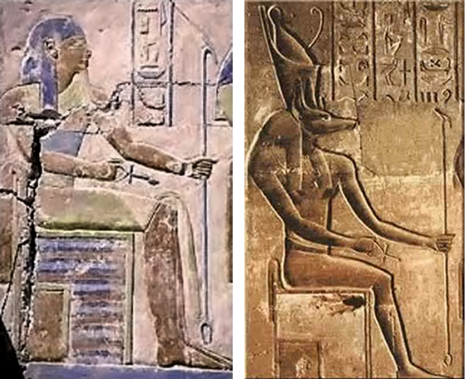На рельефах Анубис. Слева в человеческой форме, справа в образе человеко-собаки с двойной короной Египта «Две земли» на голове, с Ключом Жизни Анх в правой руке и со скипетром божественной власти Уас в левой. Не правда ли любопытный дивайс? Его навершие иногда снабжали остроухим изображением пса в более поздние египетские времена, возможно потому, что предназначение сего инструмента с закорючкой на вершине и раздвоенным концом снизу было забыто и стало символическим. Вообще, все что касается «более поздних времен» (тех, которые для нас представляют глубокую древность) еще более запутано многочисленными современными египтологами, которые не стесняются писать, что, дескать, египтяне путали Тота с Анубисом. Мне почему-то кажется что египтяне не страдали заносчивостью искусствоведов, но их жрецы выработали особый язык визуальных символов, который читали только посвященные. И в число которых эти искусствоведы не входят. Толком никто не скажет в чем предназначение тех предметов, которые мы видим чуть ли не на каждом египетском изображении. Но есть хороший способ вспомнить забытое - соединение предметов в ассоциативную ветвь, когда вы последовательно задаете себе правильные вопросы, на которые ищите правильные ответы. Для создания логической цепочки нужны факты – и тогда камешек занимает нужное место в мозаике.
