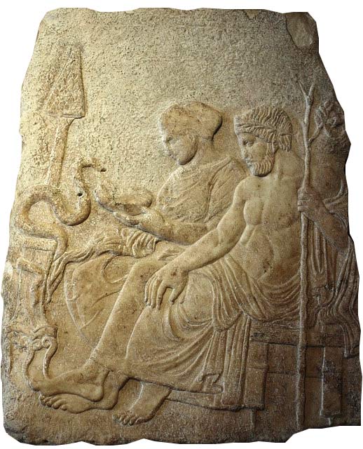 Несмотря на то, что ту же эмблему используют торговцы. Использование кадуцея в медицинском контексте у некоторых вызывает недоумение: «Как бог большой дороги и рыночной площади, Гермес был, пожалуй, прежде всего покровителем торговли и толщины кошелька: как следствие, он был защитником коммивояжера. Как посланник богов, он представляет на земле не только мир, но и смерть. И его сладкоречивое красноречие не всегда рассчитано на лучшее применение. С этой точки зрения, не будет ли его символ больше подходить для определенных конгрессменов, медицинских шарлатанов и поставщиков пылесосов, а не для терапевтов? Как проводнику мертвых в их подземные жилища, его эмблема была бы более уместна на катафалке, чем на автомобиле врача» (Stuart L. Tyson, "The Caduceus"). М-да. Ассоциации у символа не столь веселые, какие вызывает змея склонившаяся над чашей – мол, «тёща кушает мороженое» или как медики про себя шутят: «Хитер, как змей, и выпить не дурак». Спорный со многих точек зрения символ. Чаша здесь якобы символизирует яд собранный в ней. Но в медицинской практике применение змеиного яда в медицине началось не так давно. Единственное упоминание о змеином яде, как препарате, в античных источниках говорит о том, что понтийский царь Митридат VI Евпатор регулярно принимал малые порции змеиного яда, для того чтобы стать невосприимчивым к отраве. Говорят о том, дескать, чаша это символ Гигеи, дочери Асклепия, которая готовила в ней лекарства. Действительно были таковые изображения. Только мы не найдем в них изображения змеи, обвивающейся вокруг чаши. Ни в древние времена, ни в античные таковых изображений не было. Змея всегда присутствует отдельно. Либо ее кормят из этой чаши. В чаше – жертвенные приношения.
