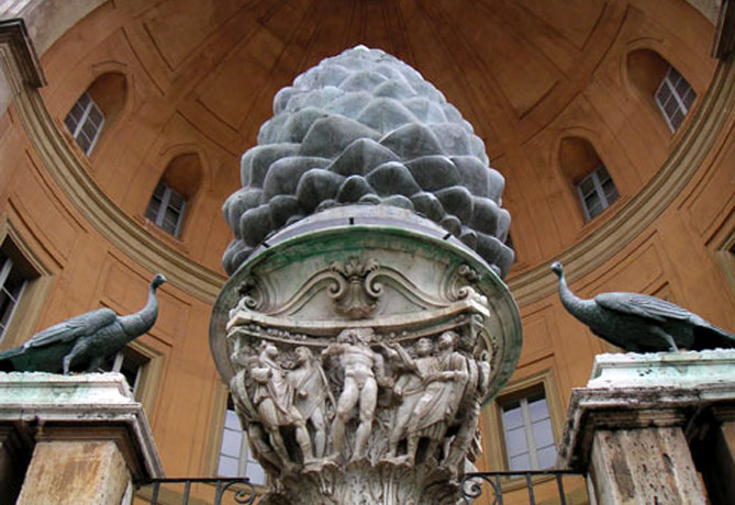 Внутренняя часть музейного комплекса Ватикана называется Giardino della Pigna, или Место Cосновой Шишки, в честь многотонной четырехметровой бронзовой статуи, представляющей простую шишку. Во внутреннем дворе, который был специально под нее спроектирован архитекторами, не нашлось место для Животворящего Креста, статуи Девы Марии, Христа или апостолов. Центральное и главнейшее место всего архитектурного комплекса занимает не христианский символ, а шишка – символ языческий. Почему языческий? Конус был смоделирован и отлит во время первого века от Р.Х. На базе имеется подпись мастера, который изготовил шишку: Publius Cincius Calvius, вольноотпущенник из рабов. Бывшее местонахождение конуса точно неизвестно – по одним сведениям это часть бывшего когда-то фонтана, по другим - найдена в развалинах мавзолея Адриана или в храме Изиды, что находился около Пантеона - но, между 498-514 гг. папой Симмахом она водружена на площади перед базиликой св. Петра, затем стала деталью нового фонтана, а позже заняла центральное место на постаменте перед гигантской аркой. Особой какой-то красотой, и по тем временам древностью, скульптура не обладала и трудно сказать, почему она избежала переплавки. Бронзовые птицы со змеиными шеями, павлины, - были изготовлены при последней установке шишки, в дополнение к ней. И если мы сопоставим изображение шишки с рельефа в Помпеях с данным изображением, с целью найти десять отличий – увидим, что птицы и змеи из Помпей здесь химерически слились в птицезмей. Два в одном. Павлин, птица не однозначная, как символ. Некоторые мусульмане считают павлина птицей дьявола – но это больше относится впрямую к Ангелу-Павлину (Тавуси Малак), которому поклонялись езиды, (курды, не считающие себя курдами). Поскольку езиды не являются «людьми Книги», значит и все воззрения их по логике подобных исламистов, сатанинские. В индуизме павлина боги используют как транспортное средство на котором ездят верхом, и видят как «солнце». В Иране павлины, стоящие с двух сторон Древа Жизни, означают дуализм и двойственную природу человека. Христиане объясняют появление павлина в иконографике тем, что это символ воскрешения, поскольку павлин не гниет (?) и меняет каждую весну свои перья. Как змея кожу, добавлю. Позже, положительное мнение о павлине сменилось на противоположное – он стал знаком надменности, заносчивой гордости, чванливости и тщеславия – что никак не сочетается с христианскими ценностями. На том месте площади, где шишку когда-то поставил Симмах, сейчас красуется скульптура «Сфера в сфере», выполненная итальянским скульптором, сеньором Помодоро. Такая фамилия.
