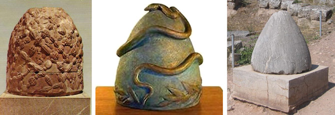 Конструктивно омфал (из тех, которые до нас дошли) представляет из себя, шишкообразный, конический, яйцеобразный камень, около метра в высоту, полый, как правило, внутри. Среднее фото - омфал, найденный на острове Делос. Слева – омфал из археологического музея в Дельфах. Это – массо-габаритная модель того омфала, который использовался в святилище Аполлона. Вывод следует из того, что реальный камень (по описаниям) обвивали повязками из виссона умащенными елеем, и которые то масло абсорбировали (возможно с техрегламентом обслуживания) – а здесь мы видим скульптурную имитацию этих "повязок". Т.е., в какое-то незапамятное время оригинал, настоящий камень, был утерян и заменен копией, его скульптурным изображением, которое сейчас показывают туристам. А может быть и не утерян, а надежно спрятан. Во всяком случае, то, что мы сейчас видим в музеях – это копии, имитации, и возможно «футляры» для реально работающего когда-то устройства. То, что камень «работал» подтверждается многочисленными отзывами авторитетных посетителей оракула и его широчайшей известностью в древнем мире.