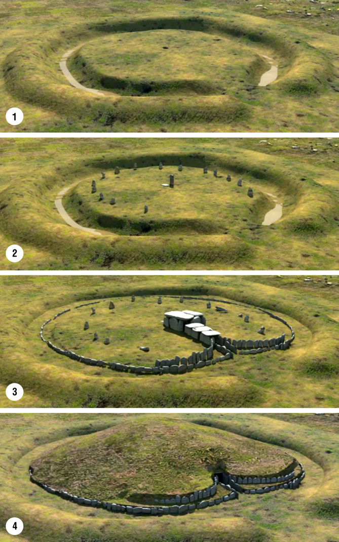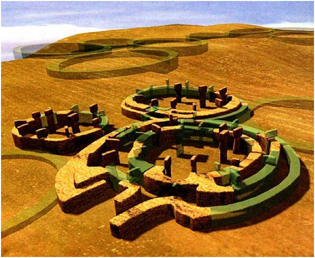 Реконструкция стадий строительства объекта включает: (1). Первоначальную защиту «от дураков» и «вандалов» в виде земляного вала и рва, наполненного водой, если только кольцеобразный ров не был конструктивным элементом объекта. Но возможно, что место просто старались сделать посуше – делали «ирригацию». (2). Установку камней-менгиров по окружности с центром-омфалом. (3). Изоляцию центрального артефакта (в данном случае ствола окаменевшего дерева) каменными плитами; устройство коридора-входа и внешнего кольца – периметра «каменного забора». (4). И когда с таким трудом построенное было готово к работе – его хоронили, насыпая сверху сотни тысяч тонн грунта, экранируя им камеру от «неба», по возможности делая искусственный холм неотличимым от окружающего пейзажа. Разумеется, ни о каком наблюдении неба, астрономическом использовании засыпанных менгиров, как и о вычислении сроков сбора урожая быть не может в данном случае. Все это представляет из себя большое каменное ухо с косточкой-резонатором в центре, направленное не к небу, но приложенное к земле. Может быть Стоунхендж просто не успели засыпать? А может быть, эта конструкция была предназначена служить точкой соединения земли и неба? Во всяком случае, есть два древних типа подобных каменных сооружений, характерной чертой которых являются «трилиты» – мегалиты-колонны, перекрытые сверху «перекладиной» или выставленные в круг, прямоугольник, огороженные и перекрытые по всему периметру без какой-либо заметной функциональной нагрузки. Одни объекты сознательно укрывались горой земли или камня, над ними возводились поздние постройки. Другие – оставались откровенно обнаженными, подняв к небу каменные зубы.