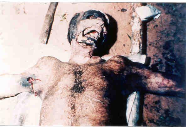 Материалов подобного рода немного. Их не афишируют. Изуродованное тело мужчины было обнаружено неподалеку от водохранилища Guarapiranga в 29 сентября 1988 г. Фотографии представляют собой «утечку информации» из Бразилии, усилиями репортеров попавшей в прессу… Там был подобный случай пропажи людей, один из которых был обнаружен висящем на ветвях дерева. Официальная версия полиции — человек захотел покончить жизнь самоубийством, разделся догола, залез на самую высокую ветку дерева. Бросился вниз, но неудачно — не долетел. Зацепился за ветку и погиб в мучениях от жажды и голода. Дырки — оттого что поранился о сучья. Глаза и уши выклевали птички, а язык, яйца и анус съели зверюшки. Крови в теле не оказалось от того, что испарилась — на палящем солнце произошла мумификация. Весьма правдоподобная версия — и всё объясняющая. Если бы еще не несколько известных подобных случаев с людьми, и не те коровки с сайта ФБР, с точно такими же «симптомами» — то вполне, вполне правдоподобная. Да вот посмотрите ещё, сравните: