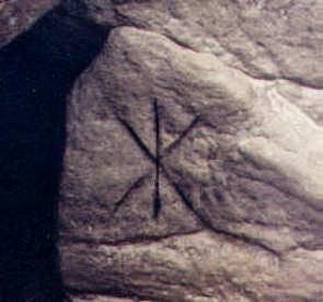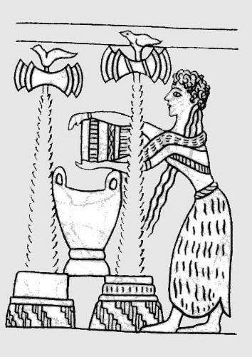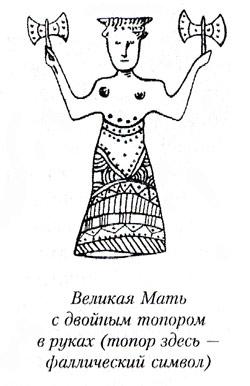 А вот под такого рода загадочными картинками-ребусами (как внизу) искусствоведы теряются. Потому что их фантазия хоть и говорит о мужском половом члене, как приоритетном аргументе в спорных вопросах о древностях, но здесь нужно под фаллосы специальную легенду сочинять, базис подводить. И сочиняют — но публика не верит. Кто-то почестнее говорит что ответа нет — это абстрактный сказочный сюжет. Ну, и что только не придумывают — вот, серьезные люди говорят что лабрисы здесь — мотыльки, типа. Крылышками бяк-бяк-бяк-бяк. А на них воробушки прыг-прыг-прыг. И публику это устраивает. Меня эта картинка тоже удивила. Ответ нарисовался как-то сам-собой, точнее пришел как смс-сообщение или коммент в ЖЖ, почти в прямом смысле. Это — радуга. Посмотрел — нет в источниках такового толкования. Но это всё же таким ухищренным способом нарисованная радуга. Точнее, объяснение ее появления. Женщина льет воду, вырываются фонтанчики (явно фонтанчики) воды и в них появляется, играет, сияющая лабрис-радуга. Отображение того божественного топора, его блеск. Всё просто. Когда показываешь. Интересно, что у лесбиянок, лабрис — их символ. Да-да — тоже приватизировали. Ну и вообще у «нетрадиционалов» в хорошем смысле — радуга. Тоже в точку, если учесть, что здесь прослеживается влияние некоторых сил — это рассмотрим чуть позже. Всё сказанное выше может чуть объяснить, почему символом Великой Богини был этот:
