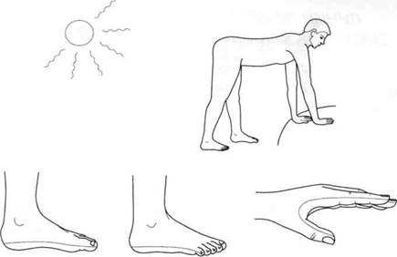 Голова человека обращена кверху, а конечности направлены вниз и параллельны телу. При рассмотрении кисти можно заметить, что большой палец имеет иное направление по сравнению с остальными пальцами (рис. 5).