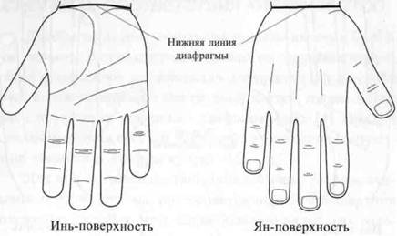 Для того чтобы хорошо ориентироваться в точках соответствия стандартных систем кистей и стоп, нужно иметь представление об Инь— и Ян‑поверхностях тела и соответствующих им поверхностях кистей и стоп. Ян‑поверхность располагается на наружных поверхностях тела, ее нельзя спрятать или скрыть. Инь‑поверхность занимает внутренние участки тела, она как бы скрыта. В положении человека стоя с опущенными вниз руками хорошо видны наружно‑боковые поверхности рук и ног,