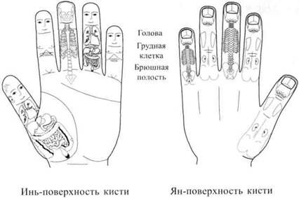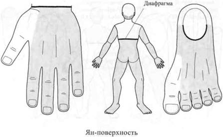 У кистей и стоп разделение на Инь— и Ян‑поверхности четко выражено. Если сжать кисть в кулак, то ладонная поверхность (Инь) окажется внутри, а тыльная (Ян) — снаружи. На стопе Ян‑поверхность соответствует тыльной стороне, а Инь‑поверхность — подошве. В стандартных системах соответствия Ян‑поверхность кистей и стоп соответствует Ян‑поверхностям тела, а Инь‑поверхность кистей и стоп — его Инь‑поверхностям. Тело проецируется на кисть и стопу в положении стоя с опущенными вниз руками, развернутыми вперед ладонями, и развернутыми наружу ногами с обращенными вперед подошвами стоп (см. рис. 10).