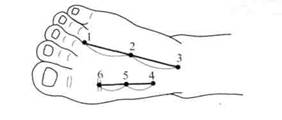 Точка 1 — расположена на кожной Точка 4 —расположена в области складке между третьим и четвертым предплюсне‑плюсневого сустава пальцами. первого пальца. Точка 3 — находится в ямке поперечного Точка б — находится на середине сустава предплюсны. плюсне‑фалангового сустава первого Точка 2 — находится на середине пальца. расстояния между точками 1 и 3. Точка 5 — на середине первой плюсневой кости между точками 4 и 6. Рис. 69. Энергетические (базисные) точки Ян‑поверхности стопы