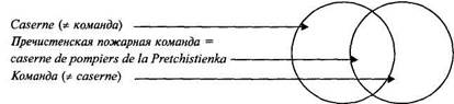 помещение группа людей Понятия, заключенные во французском слове caserne и в русском слове команда, оказываются в отношении перекрещивания. В зоне их пересечения оказывается по меньшей мере один объект: Пречистенская пожарная команда — caserne de pompiers de la Pretchistienka.
