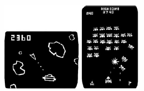 Asteroids Galaxian (векторная графика) (растровая графика) Ранние аркады такие как Asteroids, Battlezone и Star Castle, где использовалась векторная графика (изображение построено из линий). После пошла растровая графика (изображение построено из маленьких цветных квадратов - пикселей). Персонажи, как Pac-Man (Namco, 1980) and Donkey Kong (Nintendo, 1982) стали культовыми. В начале 1980-ых три стиля игровых автоматов доминировали: стойки (похожие на автоматы пополнения счета), столики (как бильярдные) и кабинки.
