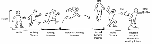 Используйте метрики для определения: • Высота: высота игрового персонажа • Ширина проходов: как правило, ширина походов чуть шире, чем ширина персонажа • Скорость ходьбы: какое расстояние игрок проходит в секунду или другую единицу времени • Скорость бега: тоже самое, но пройденное расстояние должно быть больше • Дальность прыжка: как правило, дальше шага, но не больше расстояния бега в единицу времени • Высота прыжка: основывается на росте игрока. Обычный прыжок может быть высотой в полтора игрока. Двойной прыжок может быть выше роста игрока в два раза • Расстояние атаки в ближнем бою: как правило ненамного дальше, чем длина руки игрока или оружия • Расстояние полета снаряда: как правило ограничивается областью видимости игрока