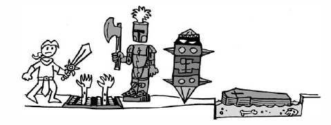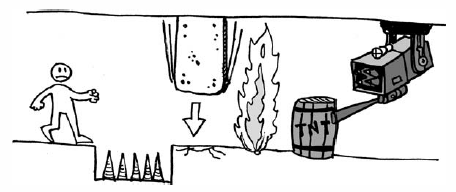 Опасности – это дитя механики, которое подсунет вам неприятность, когда вы ее не ожидаете. Чаще всего они используются для слишком нахрапистых игроков. У всех этих опасностей есть типовые приметы, они стоят в определенных местах и действуют определенным образом. Некоторые типичные виды ловушек: • Яма с кольями • Разрушение блоков • Сжигающее пламя • Взрывающиеся бочки • Ракетные установки с лазерным наведением Когда вы разрабатываете ловушки, первое правило состоит в том, чтобы удостоверится, что они выглядят опасно. Колья должны быть видимо острыми, пламя – обжигающим и т.д. Если ваша ловушка не выглядит угрожающей, нарисуйте на ней череп или другие знаки, предупреждающие игрока.