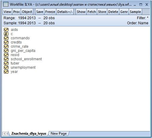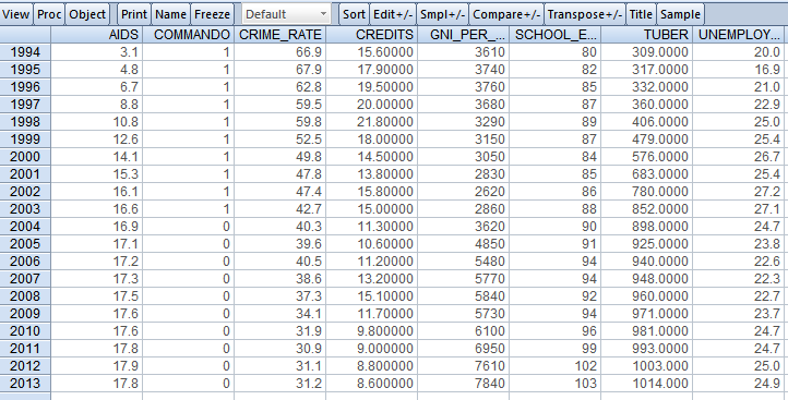 Первой моей задачей было собрать данные, необходимые для моего исследования. Данные были взяты со следующих сайтов: 1) По уровню убийств в ЮАР. National Key Points|SAPS (South African Police Service) URL: http://www.saps.gov.za/resource_centre/publications/statistics/crimestats/2013/crime_stats.php 2) По национальному доходу на душу населения. GNI per capita, Atlas method (current US$)|Data|Table URL: http://data.worldbank.org/indicator/NY.GNP.PCAP.CD 3) По количеству больных ВИЧ/СПИД. Prevalence of HIV, total (% of population ages 15-49)|Data|Table URL: http://data.worldbank.org/indicator/SH.DYN.AIDS.ZS 4) По безработице. Unemployment, total (% of total labor force) (national estimate) | Data | Table URL: http://data.worldbank.org/indicator/SL.UEM.TOTL.NE.ZS The World Factbook URL: https://www.cia.gov/library/publications/the-world-factbook/rankorder/2129rank.html 5) По охвату образования. School enrollment, secondary (% gross) | Data | Table URL: http://data.worldbank.org/indicator/SE.SEC.ENRR 6) По процентной ставке кратко- и среднесрочных кредитов частному сектору. Lending interest rate (%) | Data | Table URL: http://data.worldbank.org/indicator/FR.INR.LEND/countries 7) По уровню заболеваемости туберкулёзом на 100 тыс. чел. Incidence of tuberculosis (per 100,000 people) | Data | Table URL: http://data.worldbank.org/indicator/SH.TBS.INCD После того, как данные были собраны, мне нужно было внести их в программу EViews. В итоге были получены следующие переменные: - murder rate - уровень убийств на 100 000 чел. (на основе данных переписи населения ЮАР 2001 г.) - GNI per capita - уровень национального дохода на душу населения (в долл. США) - credits – процентная ставка на краткосрочные и среднесрочные кредиты для частного сектора - AIDS - количество больных ВИЧ/СПИД (в процентах к численности населения в возрасте от 15 до 49 лет) - tuber – количество больных туберкулёзом на 100 тыс. чел. населения - unemployment - уровень безработицы (в процентах к численности трудоспособного населения) - school enrollment - охват среднего образования (в процентах к численности населения соответствующего возраста) - commando - наличие/отсутствие системы т.н. коммандос - полувоенной организации по типу ополчения или национальной гвардии, существовавшей в ЮАР до 2003 года и занимавшейся в том числе и поддержанием правопорядка в сельской местности (1 означает существование коммандос по состоянию на отчётный год, 0 – их отсутствие) После внесения данных был получен следующий рабочий файл с данными (рис. 1):