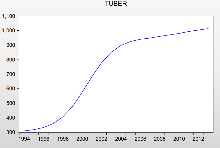 Рис. 7 – график количества больных туберкулёзом на 100 тыс. чел. населения в 1994-2013 гг.