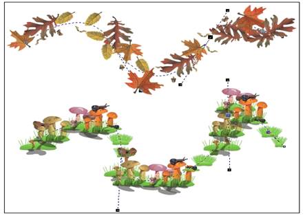 Рис. 13. Определение нового мазка и его применение для построения суперлиний 2. Теперь необходимо выделить все составные части изображения змеи. Проще всего это делается инструментом Выбор: выберите его и щелкните на свободном месте страницы, отменив таким образом выделение. Затем перетащите указатель инструмента по диагонали воображаемого прямоугольника, охватывающего изображение змеи целиком. После отпускания кнопки мыши выделенными окажутся все элементы изображения, оказавшиеся внутри этого прямоугольника. 3. Выберите в наборе инструментов инструмент Художественное оформление и включите режим кисти, щелкнув на соответствующей кнопке панели атрибутов. Затем щелкните там же на кнопке с. изображением дискеты и задайте имя файла для сохранения мазка — например zmejuka.cmx. После щелчка на кнопке ОК новый мазок готов к использованию. 4. Отмените выделение изображения змеи, нажав клавишу Esc. Перетащите указатель инструмента Художественное оформление слева направо но волнообразной траектории. После отпускания кнопки мыши наша змея... зазмеилась! 5. Чтобы свернуть змею в клубок, постройте с помощью инструмента Спираль логарифмическую спираль на 2-3 витка. Выберите инструмент Художественное оформление и, раскрыв список мазков, щелкните на образце с упрощенным изображением змеи. Если клубок окажется слишком плотным, попробуйте изменить ширину суперлинии или удалить объект и повторить этот шаг, увеличив коэффициент расширения спирали. 6. Чтобы свернуть змею в кольцо, используйте в качестве управляющей линии эллипс, построенный соответствующим инструментом. 7. Чтобы «изготовить» оригинальную прямоугольную рамку, постройте прямоугольник, а затем закруглите три его угла — кроме верхнего левого. Это поможет избавиться от резких изломов суперлинии, в которой построенный прямоугольник будет играть роль управляющей линии. Режим распылителя Режим распылителя инструмента Художественное оформление формирует не один подчиненный объект, а целую группу, размещая копии заранее определенного изображения или его отдельных частей (шаблон распылителя) вдоль управляющей линии. Два примера получающихся в результате соединенных объектов представлены на рис. 14. В обоих случаях управляющая кривая одна и та же, а шаблоны распылителя — разные. Впрочем, такие составные объекты можно отнести к линиям только с очень большой натяжкой. Функциональные возможности режима распылителя весьма широки. В частности, можно управлять размерами отдельных фрагментов изображения, входящих в шаблон распылителя, параметрами, определяющими их положение на управляющей линии, порядком следования фрагментов. В комплект поставки CorelDRAW входит большое число шаблонов распылителя, позволяющих добиваться впечатляющих декоративных эффектов. Предусмотрен также механизм пополнения числа шаблонов. Чаще всего суперлиниями, построенными в режиме распылителя, пользуются для формирования оригинальных рамок и фонов.
