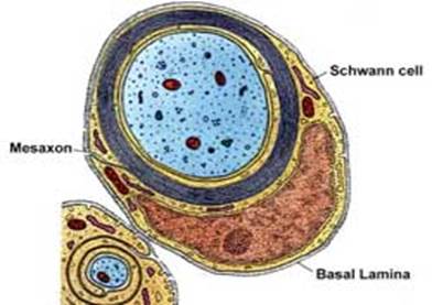 Безмиелиновые нервные волокна находятся преимущественно в составе автономной, или вегетативной, нервной системы. Нейролеммоциты оболочек безмиелиновых нервных волокон, располагаясь плотно, образуют тяжи. В нервных волокнах внутренних органов, как правило, в таком тяже имеется не один, а несколько осевых цилиндров, принадлежащих различным нейронам. Они могут, покидая одно волокно, переходить в соседнее. Такие волокна, содержащие несколько осевых цилиндров, называются волокнами кабельного типа. По мере погружения осевых цилиндров в тяж нейролеммоцитов оболочки последних прогибаются, плотно охватывают осевые цилиндры и, смыкаясь над ними, образуют глубокие складки, на дне которых и располагаются отдельные осевые цилиндры. Сближенные в области складки участки оболочки нейролеммоцита образуют сдвоенную мембрану — мезаксон, на которой как бы подвешен осевой цилиндр. Миелиновые нервные волокна встречаются как в центральной, так и в периферической нервной системе. Они значительно толще безмиелиновых нервных волокон. Они также состоят из осевого цилиндра, «одетого» оболочкой из нейролеммоцитов Шванна, но диаметр осевых цилиндров этого типа волокон значительно толще, а оболочка сложнее. Миелиновый слой оболочки такого волокна содержит значительное количество липидов, поэтому при обработке осмиевой кислотой он окрашивается в темно-коричневый цвет. В миелиновом слое периодически встречаются узкие светлые линии—насечки миелина, или насечки Шмидта — Лантермана. Через определенные интервалы (1—2 мм) видны участки волокна, лишенные миелинового слоя, — это т.н. узловатые перехваты, или перехваты Ранвье.