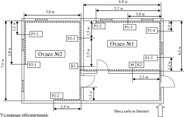 Рисунок 4 – План размещения сетевого оборудования и трасс прокладки кабелей План размещения сетевого оборудования и трасс прокладки кабелей