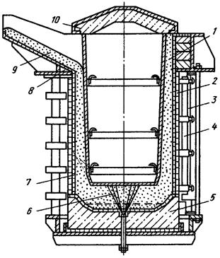 Футеровка индукционных тигельных печей (см. рис. 3) состоит из 6 основных элементов: тигля, подины, воротника, сливного носка, крышки печи и обмазки индуктора. Основным элементом футеровки является тигель, поэтому правильный выбор огнеупорного материала для тигля в основном обеспечивает надежность работы печи и ее технико-экономические показатели, заложенные в конструктивном решении печи.