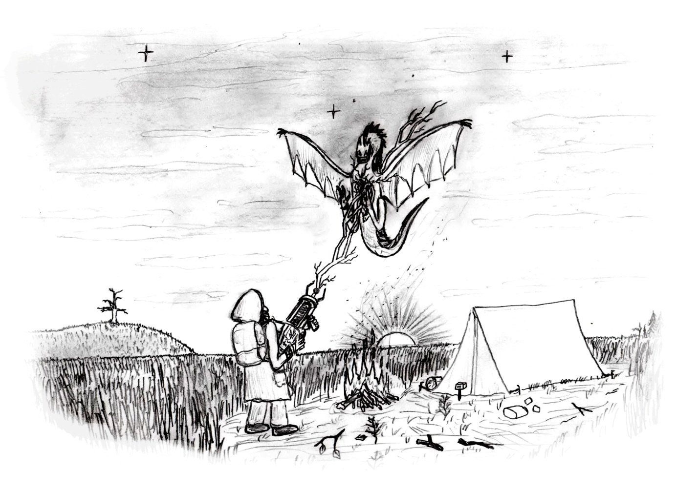 Яр уже ушел достаточно далеко от деревни Сергея. Нужно было готовиться к ночевке. В поле Яр утоптал траву, развернул палатку и оставил некоторые вещи в ней. Возле входа в палатку поставил прибор, отпугивающий животных. Чтобы развести костер, Яр пошел в Лес, взяв Тесло-пушку и надев противогаз. Шелест листьев под ногами. Комары «стучатся» в стекла противогаза. Приходится раздвигать руками ветки кустов и молодых деревьев. Счетчик Гейгера тихо трещит на поясе. Набрав сухих палок и веток, Яр вернулся к палатке, убрал пушку за спину и развел костер. Только Яр решил присесть и отдохнуть, как вдруг раздался свист. Яр ощутил сильный страх на пару секунд, тут же вскочил с места, но на его счастье свист исчез и он пришел в себя, схватив пушку, которую еще не успел выключить. Оглянувшись назад, взор упал на ящера с крыльями, который летел прямо на него. Всё произошло за пару секунд: между Яром и ящером оставалось метров десять. Быстро наставив пушку на ящера, Яр нажимает курок, и мощная электрическая дуга бьет прямо в грудь этого монстра. Раздается крик мутанта, но мертвое тело монстра было близко и, двигаясь по инерции, сбивает Яра с ног, падая вместе с ним на землю. Яр думал в этот момент, что монстр еще жив, и настал конец. Однако, после падения на землю, монстр уже не шевелился и лишь сильно давил своим весом. Яр отодвинул с себя ящера и стал его осматривать. В груди была большая обугленная дыра. Виднелись ребра. По коже шли обугленные следы от молний. Туловище ящера было соизмеримо с телом человека, если не брать в расчет длину хвоста.