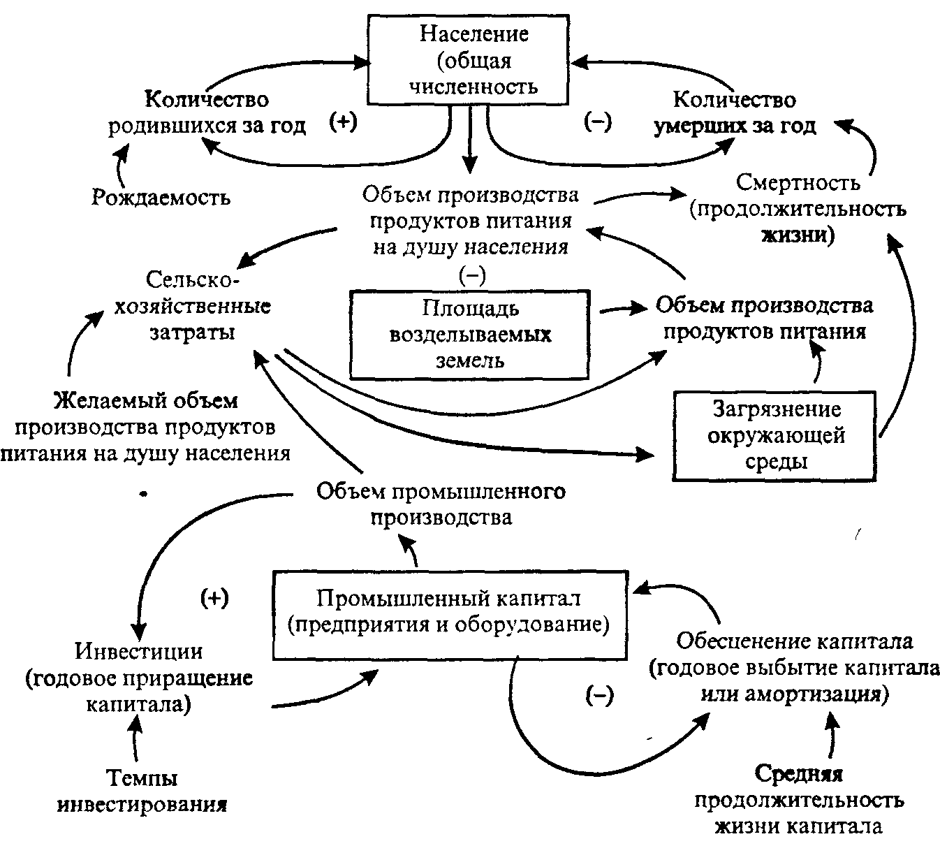 Рассмотренные выше модели представляли собой математические образы отдельных процессов и явлений. Каждая из них интересна по-своему, важна для конкретной науки или вида деятельности. Но всеэто по своей общечеловеческой важности уступает самому значимому для нас всех вопросу: каково ближайшее будущее человечества как вида в целом? Как будет развиваться мир в обозримом будущем? Подчеркнем, что речь идет не о политических или экономических прогнозах для какой-то конкретной страны или общества - такие прогнозы, во-первых, в стабильных ситуациях тривиальны, а в нестабильных - мало что значат, а во-вторых, представляют собой интерес, в основном, для жителей этой страны или территории. Речь идет именно о человечестве в целом - какое у него (у нас всех, живущих на Земле) будущее? Люди в текущей жизни имеют много конкретных проблем и мало склонны к таким общим размышлениям. Жизнь отдельного человека слишком коротка, и еще век-другой назад глобальные изменения в мире на протяжении жизни одного человека были не очень заметны - даже если он жил в достаточно бурную эпоху. Но в XX веке темпы событий ускорились так, как этого никогда не было в истории человечества, и мы стали все чаще слышать предсказания грядущих глобальных катастроф - гибель природы из-за промышленных загрязнений, невесть откуда взявшиеся «озоновые дыры» в защищающей нас от космических излучений стратосфере, истощение средств воспроизведения кислорода из-за массовой вырубки лесов и т.д. Хотя часть этих страхов нагнетается шарлатанами или заинтересованными в запугивании людей деятелями без каких-либо серьезных обоснований, это не означает отсутствия проблемы - наоборот, она более чем реальна. Даже не столь катастрофические события - например, истощение природных ископаемых - может привести к совершенно радикальным переменам в образе жизни человечества, и при этом, в первую очередь, в странах, которые сегодня являются наиболее промышленно развитыми. Будущее человечества определяется столь огромным количеством процессов, частично им контролируемых, частично нет, и эти процессы столь взаимосвязаны и имеют столь противоречивые последствия, что лишь математическое моделирование их во всей разумной совокупности, реализуемое на современных компьютерах, может дать качественно верный прогноз. При этом замечательно высказанная великим русским писателем мысль, вынесенная в эпиграф, никогда не должна забываться. Как бы велико ни было неизбежное огрубление реальности при таком моделировании, остаются столько обобщенных факторов «первого ранга»,чтопроследить их неизбежную интерференцию не под силу даже самому могучему уму. Такие модели, получившие название глобальных (всеохватывающих), начали возникать в 70-х годах нашего века. Наиболее известны модели МИР-1, МИР-2, МИР-3, сформулированные и изученные группой сотрудников Массачусетского технологического института (США) под руководством Д.Х.Медоуз и Д.Форрестера. Работы были начаты по поручению «Римского клуба» - международной неправительственной группы выдающихся государственных деятелей, ученых, бизнесменов. Результаты в свое время произвели в западном мире сенсацию, ибо большинство сценариев возможного развития событий вели к результатам, которые можно назвать концом света (разумеется, с точки зрения человечества). В