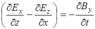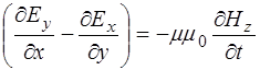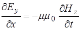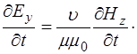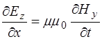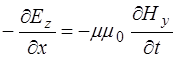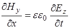 Поскольку изменения полей по осям Y и Z нет, то соот-ветствующие дифференциалы равны нулю, остается толь-ко изменение полей по оси X. Это позволяет упростить уравнения (8.41) – (8.43) и, с добавлением (8.32) по-лучить систему уравнений, описывающих связь между проекциями векторов напряженности электрического и магнитного полей на оси: