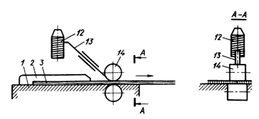 1 — стол станка 2 направляющая линейка; 3 — делянка шпона; 4 — рифленые валики; 5 клеевая лента; 6 — прижимной ролик; 7 — направляющий ролик; 8 — увлажняющий валик; 9 — ванночка; 10 — подогреваемый ролик; 11 — конический ролик; 12 — бобина, 13 — расплавляюшая трубка; 14 — валец. Рисунок 2.3 – Схема ребросклеивания клеевой нитью