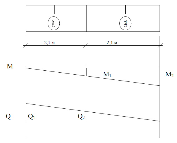 Обчислюємо величину діючих зусиль в поперечному перерізу головної балки: А) для випадку завантаження на 2 смуги: