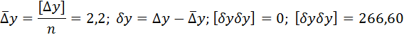Знаходимо ∆x і ∆y по стовпцях 6 та 7 [ ∆x ] = +1,0; [ ∆y ]= – 22,0. У стовпці 6 [ ∆x ]=0,1´ n, тому можемо відразу обчислити значення ∆х∆х (стовпчик 8) і його суму [ ∆х∆х ] = 270,0. У стовпчику 7 [ ∆y ] > 0,1´n, тому треба виключити систематичну похибку і знайти δу, та [δyδy]. Обчислюємо: