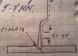 5)Наметить на верх.часть рукава по вспомогательному лекалу линию стачивания припусков на шлицу и перегиба низа. 6)Подрезать по намеченной линии оставляя припуск 5-7мм. 7)Стачать угол верх. части шлицы со стороны шлицы швом 5-7мм. 8)Разутюжить припуски шва, вывернуть угол шлицы и выправить. 9)Перегнуть припуск на подгиб низа на лицо, и обтачать угол нижней части шлицы швом 0,5см,уравнивая линии низа по нижней и верхней частях рукава. 10)Вывернуть и выправить угол. 11)Уравнять углы шлицы верх. и ниж. частей рукава, по линии низа рукава и скрестить части рукава на стачивающей машине со стороны припусков на шлицы, двумя обратными строчками на 7-10мм от срезов припуска на подгиб низа рукава на участке длинной 5-7мм.