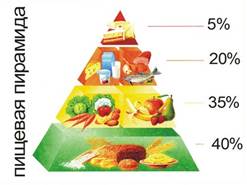 1 уровень пищевой пирамиды - цельнозерновые продукты и судя по картинке их должно быть достаточное количество каждый день. Это каши – гречневая, овсяная, рис неочищенный, макароны из пшеничной муки твёрдых сортов, хлеб зерновой. Это углеводные продукты. Польза углеводов в обеспечении организма энергией. Без них не только не будет ни сил, но и, как оказывается, здоровья. Внимание! Сюда не входят булки, дрожжевой хлеб, торты, пирожное.:Sad: Вопрос: «Сколько?» вполне логичный. Диетологи советуют в день съедать от 6 до 9 порций. 1 порция: 1 ломтик хлеба (зернового) 1/2 чашки макарон (приготовленных) 1/3 чашки риса (приготовленного) Для вкуса добавлять к ним можно любое масло. Такая еда не только источник энергии, но и витаминов, которые стимулируют иммунную систему. 2 уровень уровень пищевой пирамиды - овоши и фрукты. И снова сколько? Овощей и фруктов есть от 400- 800 г. в день. Овощей 5 порций. Фруктов от 3 до 5 порций. 1 порция фруктов – 1 апельсин, или 1 яблоко, или 1 чашка нарезанных фруктов, или 1/3 чашки сока. 3 уровень пищевой пирамиды - белковая пища. О ней мы уже говорили. Таких продуктов следует потреблять от 4 до 8 порций. 1 порция: 30 г приготовленного мяса, птицы или рыбы, 1/2 чашки бобов, гороха или чечевицы, 1 яйцо или 2 белка, 30-60 г обезжиренного сыра, 1/4 чашки обезжиренного творога Молочных продуктов в ежедневном рационе должно быть 2 порции 1 порция – 1 чашка обезжиренного йогурта, кефира. 4 уровень – жиросодержащий сюда входят орехи, животные и растительные масла. А теперь подведём итог всей информации. Питаться не реже 3 раз в день. Мясо есть 1 раз в день. Пищу лучше готовить на пару, тушить, запекать! Масло употреблять не более 1-2 столовых ложек в день, заправляя салаты. Овощей и фруктов есть от 400- 800 г. в день. Из овощей и фруктов можно готовить соки. Утром выпивать 1 стакан чистой воды, умыли лицо, умываем организм. Пить достаточно чистой воды в течение дня. Режим питания рекомендуют следующий: