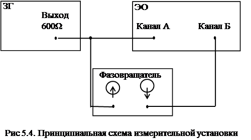 Опыт 2. Исследование сдвига фаз между периодически-ми сигналами от одного генератора. Сравнение фаз между двумя сигналами одной частоты можно осуществить, используя двухканальный режим рабо-ты осциллографа. Электрическая схема измерительной установки представ-лена на рис. 5.4.