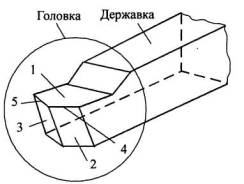 Из всех видов токарных резцов наиболее распространенными являются проходные резцы. Они предназначены для точения наружных поверхностей, подрезки торцов, уступов и т.д. Призматическое тело npoходного резца (рис. 1), как и любого другого, состоит из режущей части (головки) и державки. Головка резца содержит переднюю 1, главную заднюю 2 и вспомогательную заднюю 3 поверхности. Пересечения этих поверхностей образуют главную 4 и вспомогательную 5 режущие кромки. 3 – вспомогательная задняя поверхность; 4 – главная режущая кромка; 5 – вспомогательная режущая кромка По передней поверхности сходит снимаемая резцом стружка. Главная задняя поверхность обращена к поверхности резания, образуемой главной режущей кромкой, а вспомогательная задняя поверхность – к обработанной поверхности детали. Указанные поверхности и режущие кромки после заточки располагаются под определенными углами относительно двух координатных плоскостей и направления подачи, выбираемыми с учетом кинематики станка. За координатные плоскости (рис. 2) принимают две взаимно перпендикулярные плоскости: 1) плоскость резания, проходящую через главную режущую кромку, и вектор скорости резания, касательный к поверхности резания; 2) основную плоскость, проходящую через эту же кромку и нормаль к вектору скорости резания. Есть другое определение основной плоскости: это плоскость, проходящая через векторы продольной Sпр и радиальной Sр подач; в частном случае может совпадать с основанием резца, и в этом случае возможно измерение углов резца вне станка в его статическом положении. На рис. 2 представлены вид заготовки и резца в плане и геометрические параметры, обязательно указываемые на рабочих чертежах резцов: γ, α, α1, φ, φ1. Ниже даны определения и рекомендации по назначению их величин. Передний и задний углы главной режущей кромки принято измерять в главной секущей плоскости N–N, проходящей нормально к проекции этой кромки на основную плоскость, которая в данном случае совпадает с плоскостью чертежа. Плоскость N–N выбрана в связи с тем, что именно в ней происходит деформация металла при резании. Передний угол γ – это угол между основной плоскостью и плоскостью, касательной к передней поверхности. Величина этого угла оказывает на процесс резания определяющее влияние, так как от него зависят степень деформации металла при переходе в стружку, силовая и тепловая нагрузки на режущий клин, прочность клина и условия отвода тепла из зоны резания. Оптимальное значение переднего угла γ определяется опытным путем в зависимости от физико-механических свойств обрабатываемого и режущего материалов, факторов режима резания (V, S, t) и других условий обработки. Возможные значения угла γ находятся в пределах 0...30°. Для упрочнения режущего клина, особенно изготовленного из хрупких режущих материалов, на передней поверхности затачивают фаску с нулевым или отрицательным передним углом (γф = 0...–5°), шириной f, зависящей от подачи. Задний угол α – это угол между плоскостью резания и плоскостью, касательной к задней поверхности. Фактически это угол зазора, препятствующего трению задней поверхности резца о поверхность резания. Он влияет на интенсивность износа резца и в сочетании с углом γ влияет на прочность режущего клина и условия отвода тепла из зоны резания. Чем меньшую нагрузку испытывает ре