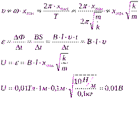 Металлический стержень массой 100 г и длиной 1 м подвешен за середину к пружине с жесткостью 10 Н/м. Стержень совершает гармонические колебания с амплитудой 10 см в однородном магнитном поле индукцией 0,01 Тл, направленном перпендикулярно плоскости колебаний. Найдите максимальную разность потенциалов, возникающую на концах стержня.
