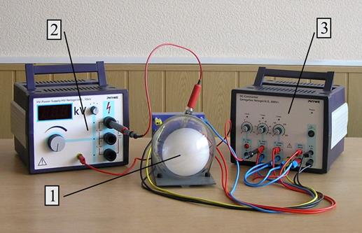 Рис.4. Экспериментальная установка для изучения дифракции электронов 1- электронно-лучевая трубка; 2 – источник высокого напряжения; 3 – универсальный источник питания Устройство специальной электронно-лучевой трубки и схема подключения ее представлена на рис.5 и рис.6. В вакуумированной сферической стеклянной колбе находится электронная пушка, позволяющая формировать сфокусированный электронный пучок из электронов, испущенных катодом в результате термоэлектронной эмиссии. Электроны этого пучка обладают одинаковой кинетической энергией, определяемой ускоряющей разностью потенциалов U а, которая приложена между катодом и анодом. Ускоренные электрическим полем электроны дифрагируют на тонком поликристаллическом слое графита и формируют кольцеобразную дифракционную картину, которая визуализируется с помощью флуоресцентного слоя, нанесенного на внутреннею поверхность стеклянной колбы.