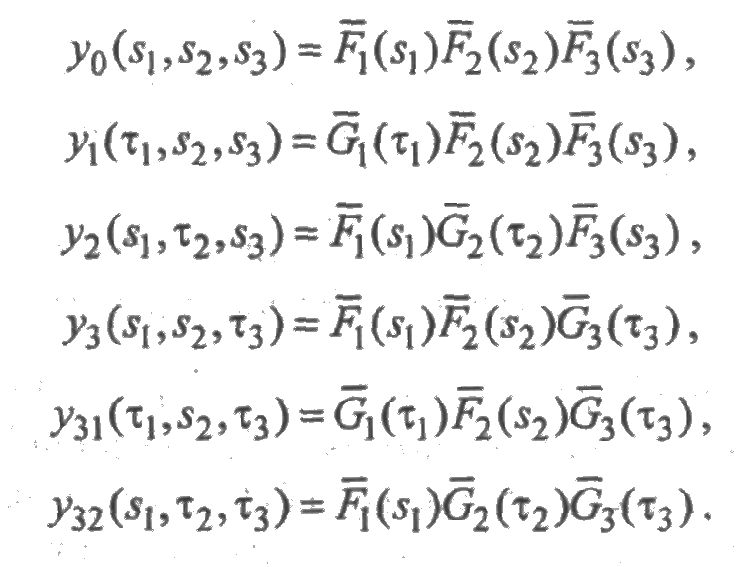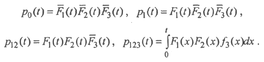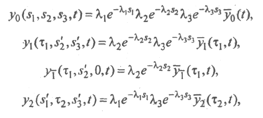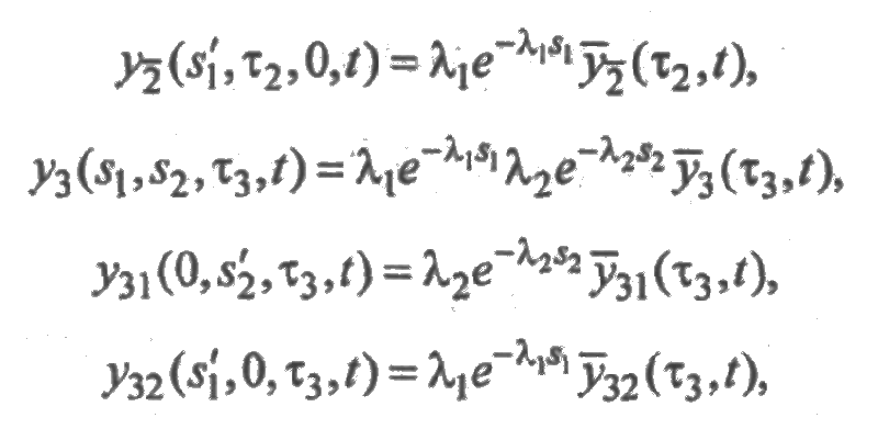 Решение. Как и прежде, устройство имеет 6 возможных состояний и 6 неизвестных функций: y0(s1,s2,s3,t), y1(0,s2’,s3’,t), y2(s1’,0,s3’,t), y3(s1,s2,0,t), y31(0,s2’,0,t), y32(s1’,0,0,t). Считая, что в момент времени t=0 все элементы исправны, будем иметь следующую систему интегральных уравнений: