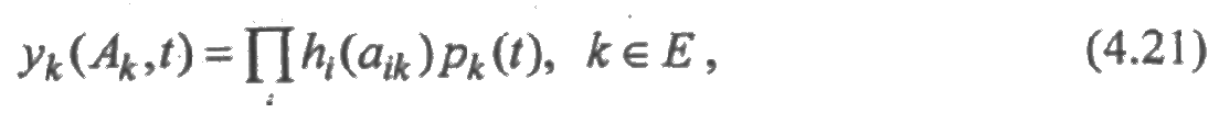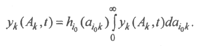 В соотношении (4.22) i = i(j,k) — номер элемента, вызвавшего переход из состояния j в состояние k. Это уравнение показывает, что функции рk(t) удовлетворяют уравнениям Колмогорова, справедливым для экспоненциальных распределений, и, следовательно, рk(t) есть вероятность пребывания системы в момент t в состоянии k. Таким образом, функции (4.21), в которых вероятности рk(t) определяются системой (4.22), являются искомым решением системы дифференциальных (и интегральных) уравнений, описывающих функционирование технической системы с экспоненциальными распределениями. Заметим также, что если какой-либо компоненте вектора Аk с номером i1 соответствует плотность hi1, экспоненциального распределения, а остальные плотности hi, произвольные, то число аргументов функций уk уменьшается, т. к.