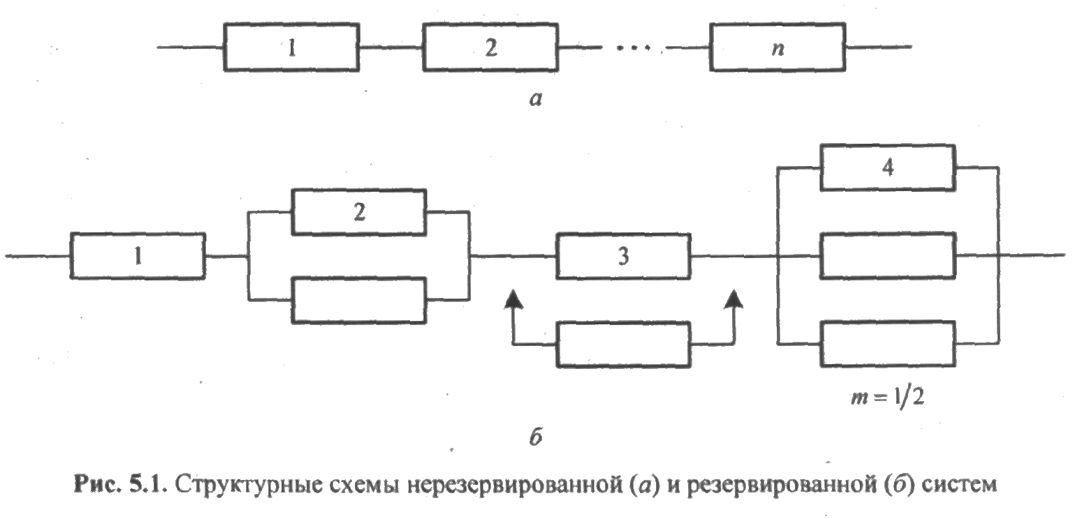 5.1.1. Структурная схема системы Каждый элемент сложной системы изображается в виде геометрической фигуры, чаще всего прямоугольника. Прямоугольники соединяют линиями таким образом, чтобы полученная структурная схема отображала условия работоспособности. В качестве примера на рис. 5.1 приведены соответственно структурные схемы нерезервированной системы, состоящей из п элементов, и системы с раздельным (поэлементным) резервированием. Резервирование элементов осуществляется методами постоянно включенного резерва, замещением и с дробной кратностью т=1/2. Из структурных схем наглядно видны условия работоспособности. Система на рис. 5.1, а работоспособна, если все ее элементы исправны. Отказ любого элемента нарушает работоспособность системы, наступает ее отказ. Система на рис. 5.1, б работоспособна, если исправным является элемент 1 и любой один элемент дублированных пар, а также два любых элемента из трех резервированных с дробной кратностью т = 1/2. Высокая наглядность — основное достоинство этого метода. Его недостатком является далеко не полная информация о функционировании системы. Например, из рис. 5.1 не ясно: ремонтируемая или перемонтируемая система, дублирование осуществлено равнонадежными элементами или нет, какова дисциплина обслуживания системы, если она ремонтируемая (количество ремонтных бригад, приоритетность обслуживания), какова кратность резервирования в случае резервирования с дробной кратностью.