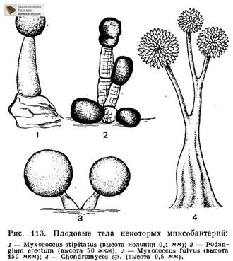 Истинные миксобактерии, образующие плодовые тела, представлены в природе следующими родами: миксококкус (Myxococcus), сорангиум (Sorangium), хондромицес (Chondromyces), хондрококкус (Chondrococcus), архангиум (Archangium), полиангиум (Polyangium), мелитангиум (Melittangium), подангиум (Podangium), стелангиум (Stelangium), синангиум (Synangium), ангиококкус (Angiococcus) (рис. 113).
