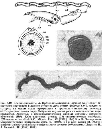 Строение клетки. В клетках спирохет можно различать три главных компонента: протоплазматический цилиндр, осевые фибриллы и наружную оболочку (рис. 3.10). Спирально извитой протоплазматический цилиндр снаружи окружен комплексом из плазматической мембраны и клеточной стенки. Вокруг цилиндра обвиваются нити, называемые по отдельности осевыми фибриллами, а в совокупности-аксостилем. Каждая фибрилла одним концом прикреплена вблизи конца клетки, а другой ее конец свободен. Число фибрилл варьирует от вида к виду: у Treponema pallidum и Leptospira имеется чаще всего 4 фибриллы, у Borrelia до 18, а у Cristispira более сотни. На обоих концах клетки прикреплено примерно одинаковое число фибрилл; в середине или по всей длине клетки фибриллы перекрывают друг друга. Наружная мембрана охватывает протоплазматический цилиндр и фибриллы.